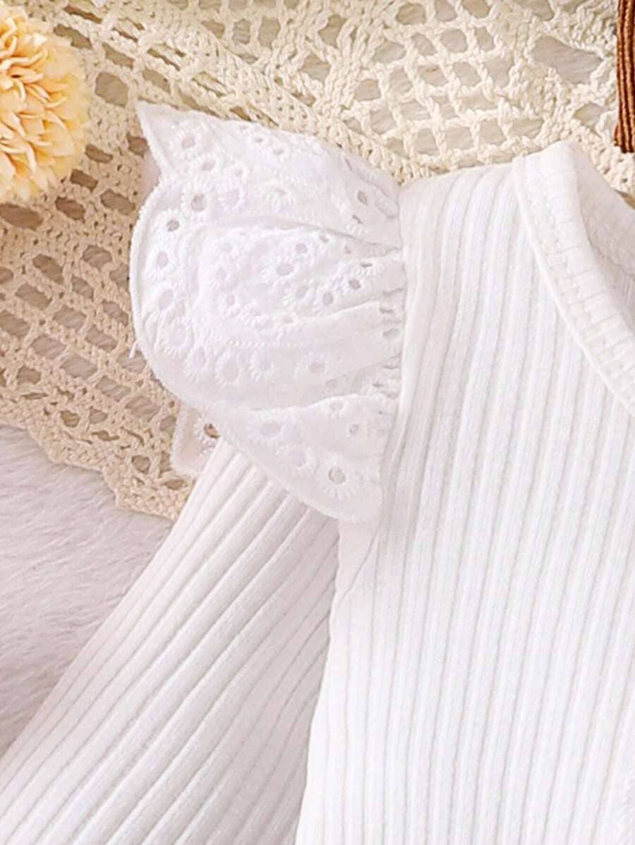 Détails féminins Haut blanc en fines côtes avec des volants transparents sur les épaules.