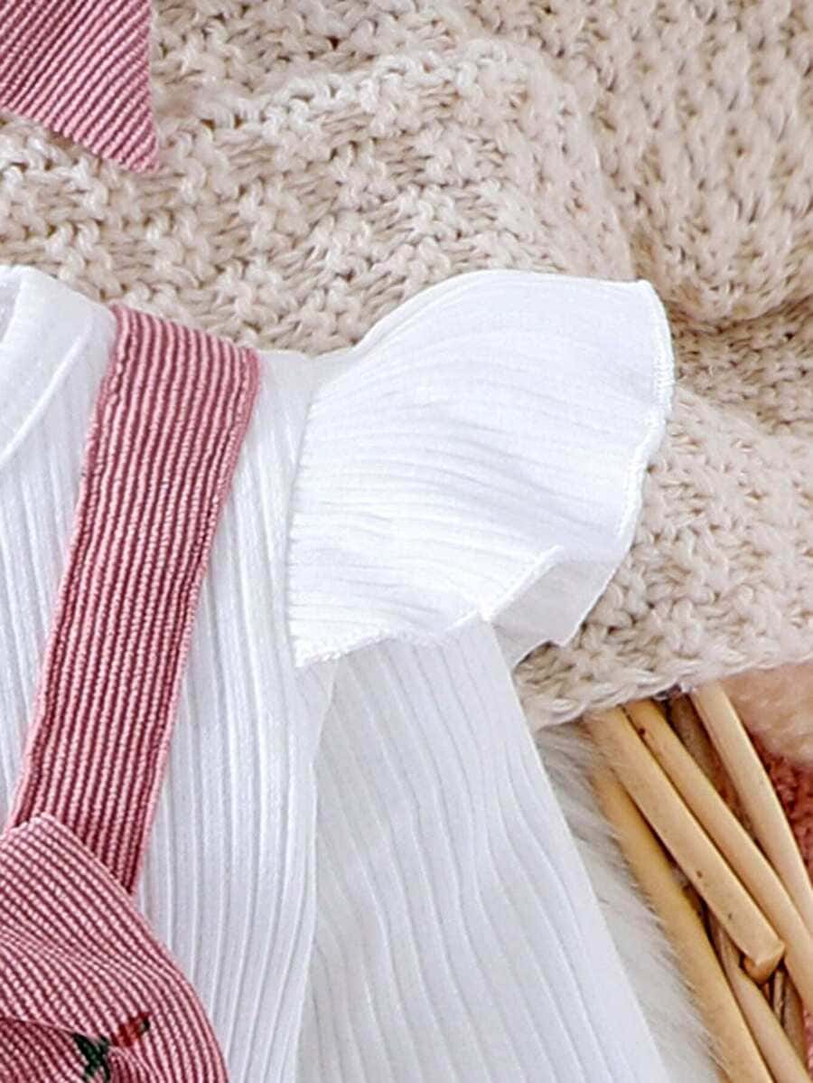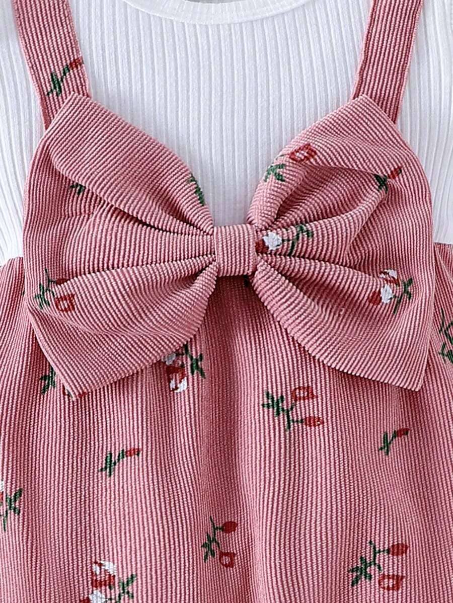 Design sophistiqué Barboteuse en velours côtelé rose avec un gros nœud sur la poitrine et un délicat motif floral.
