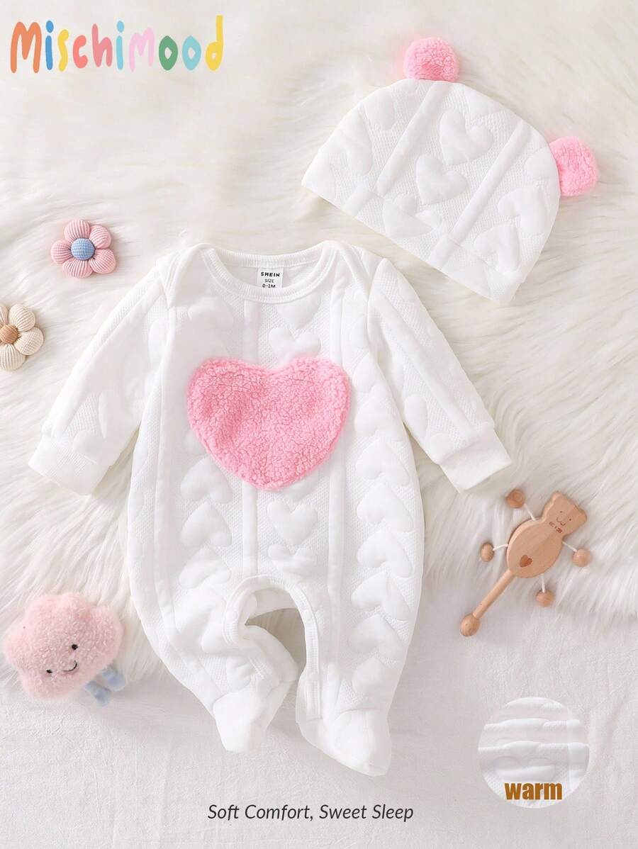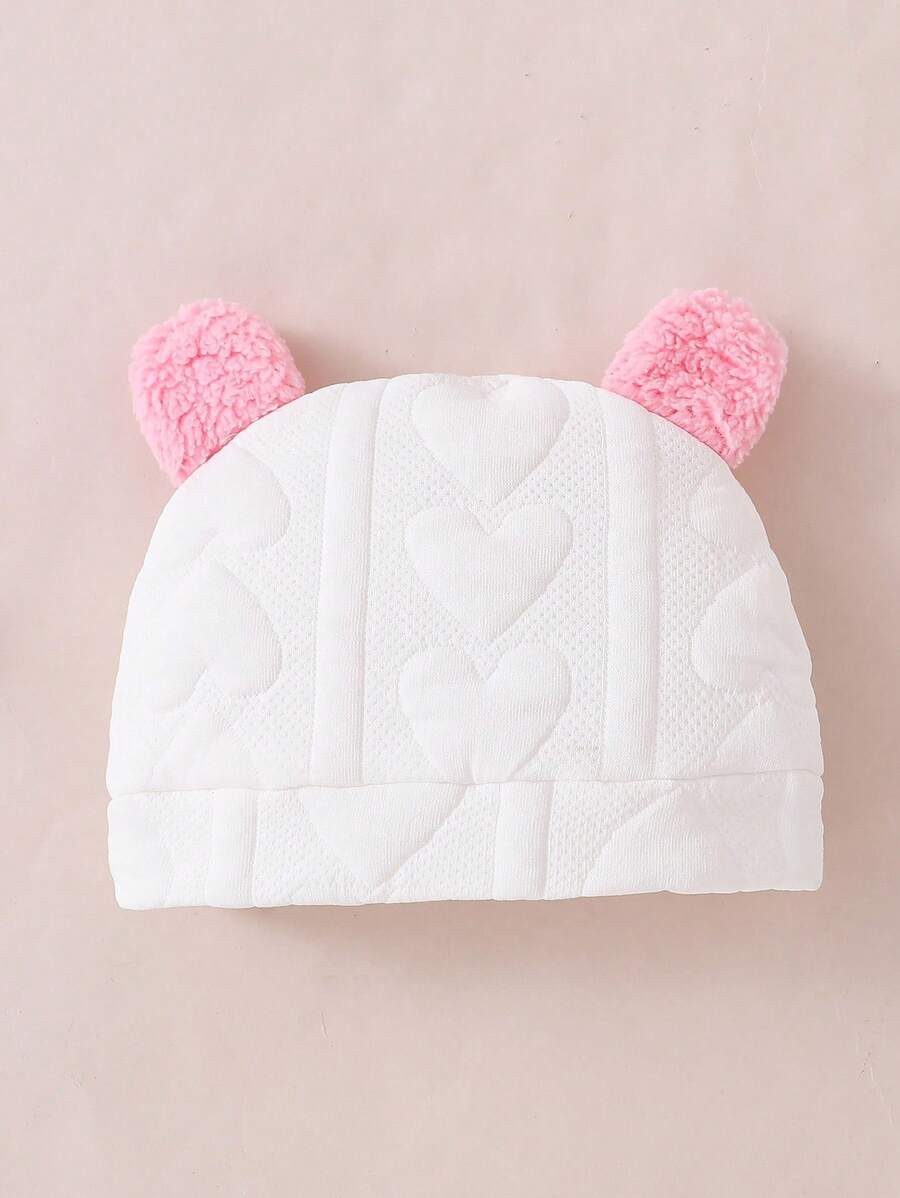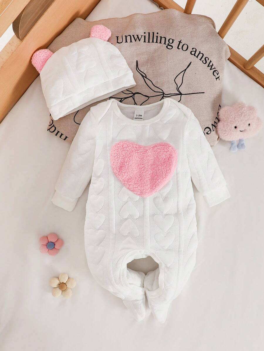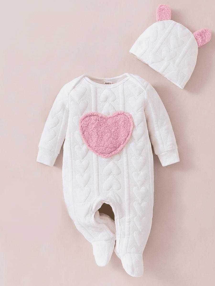 Grand cœur rose en peluche sur la poitrine et bonnet assorti avec petits pompons roses.