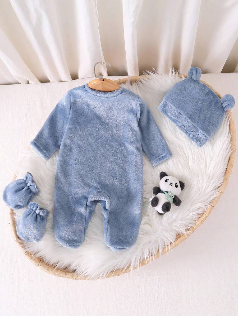 Ensemble complet pour nouveau-né : Comprend un pyjama à pieds, un bonnet assorti, une paire de moufles et un petit panda assorti.