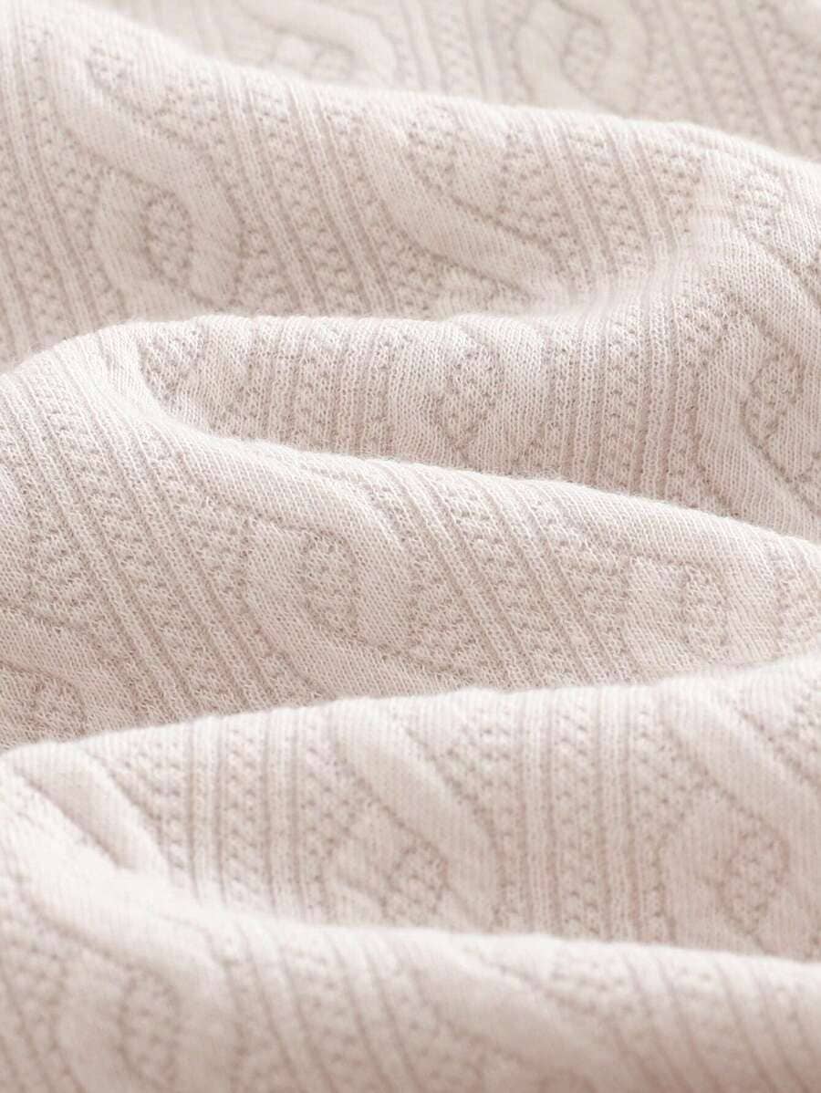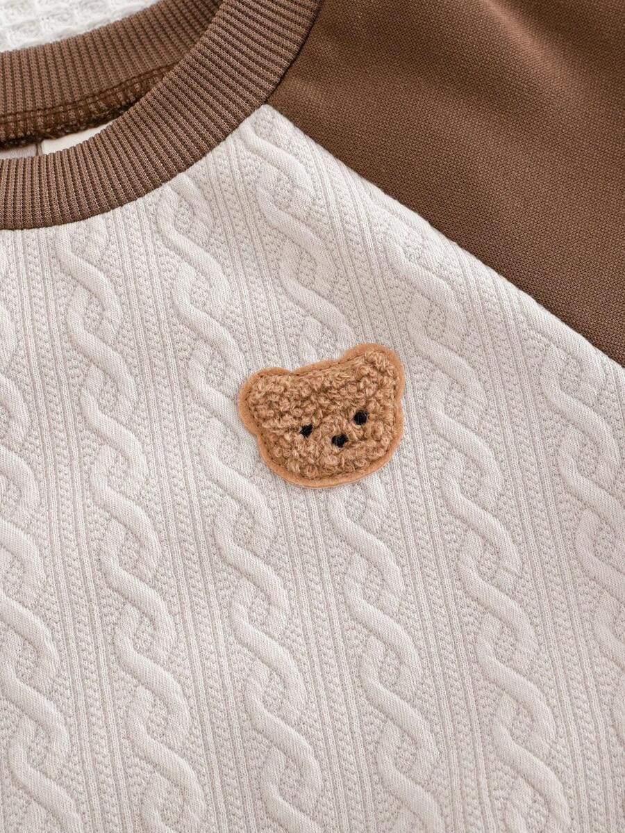 Haut : Un sweat douillet avec un panneau central en tricot câblé de couleur crème, décoré d’un petit écusson d’ours en relief.